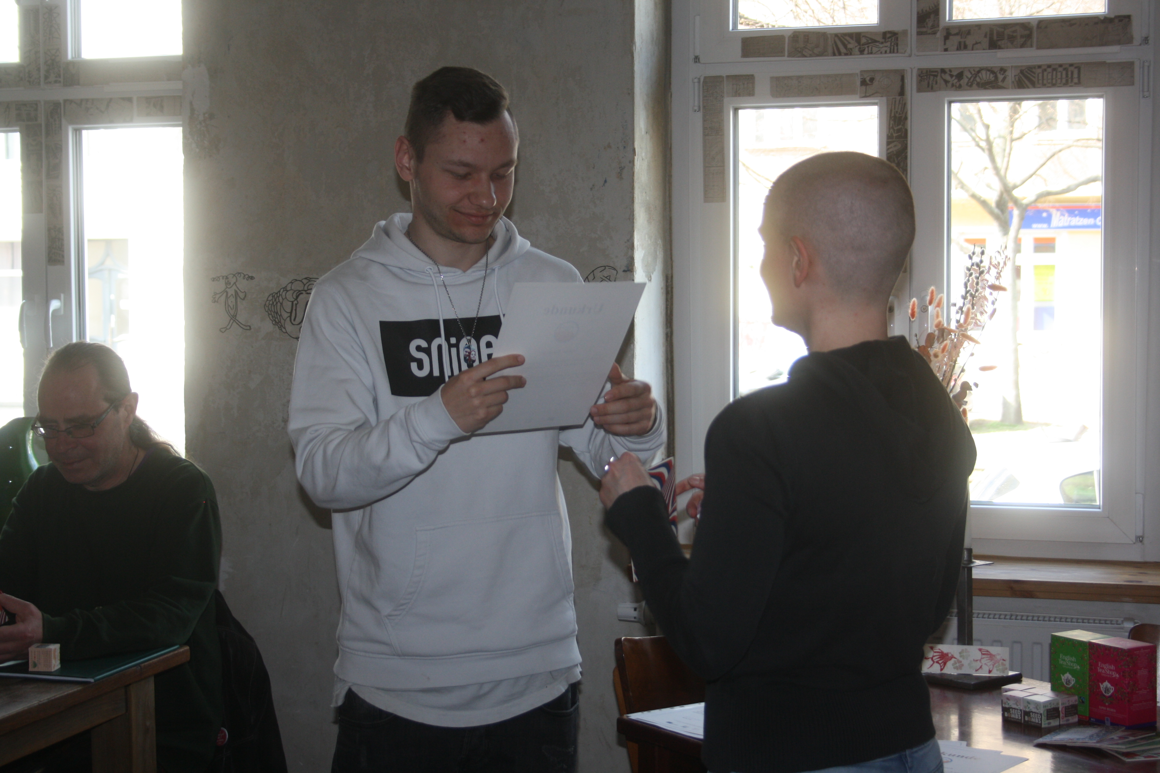 Urkundenverleihung am Tag der Oscarverleihung. Das ist dann wohl ein Zeichen, dass uns allen Großartiges ins Haus steht! Jedenfalls war am letzten Sonntag (27.03.2022) die Urkundenübergabe des letzten Projektdurchlaufs und damit von „Zurück ins Leben!“ insgesamt. Es gab gutes Essen, kleine Geschenke und Überraschungseier noch und nöcher. Und zum Schluss gab es noch ein schönes Gruppenfoto in der warmen Märzsonne!