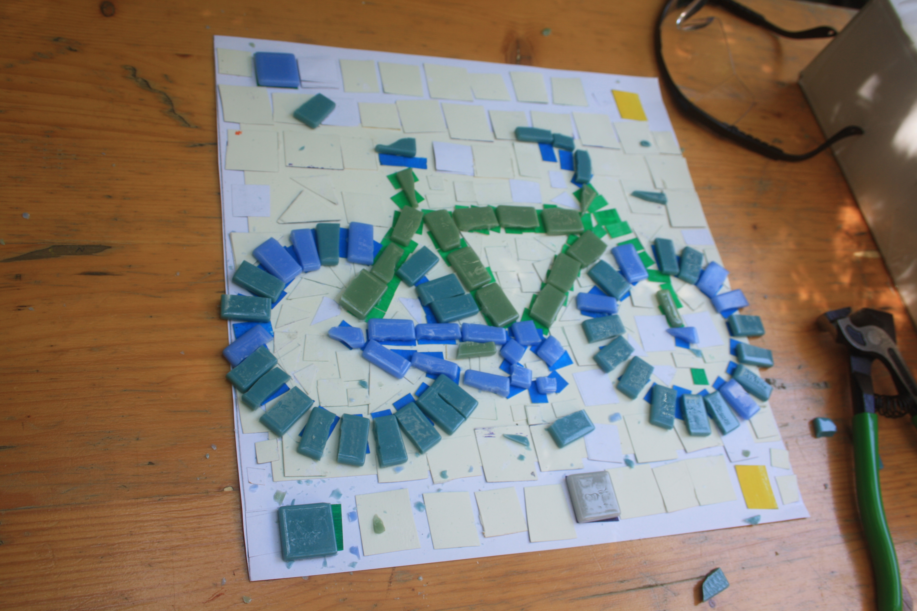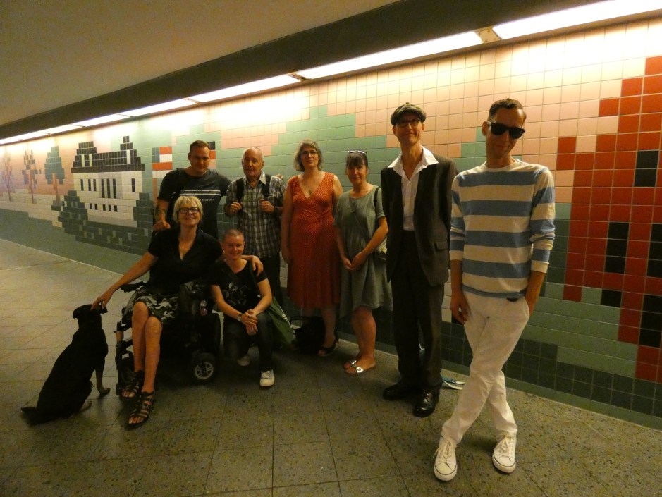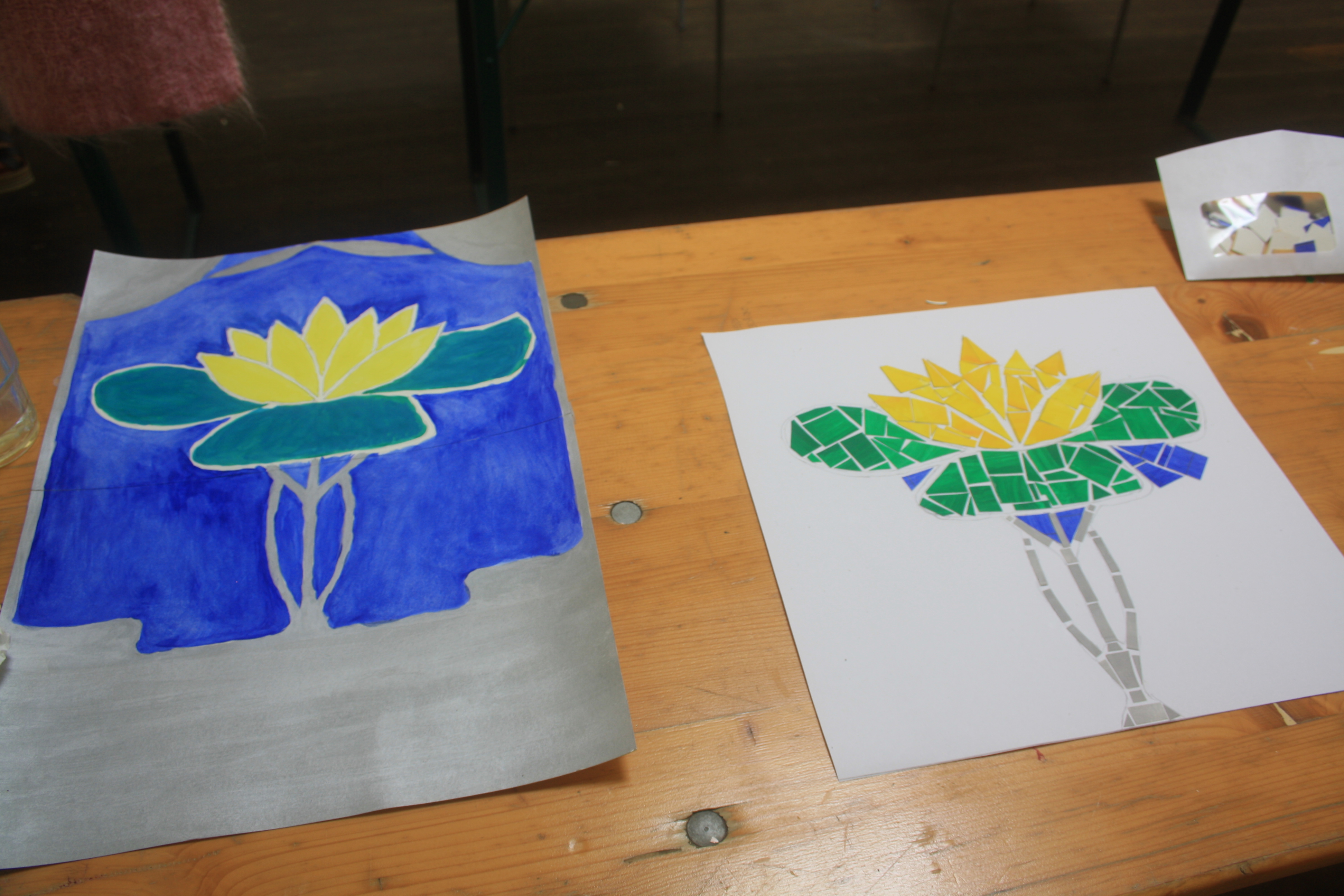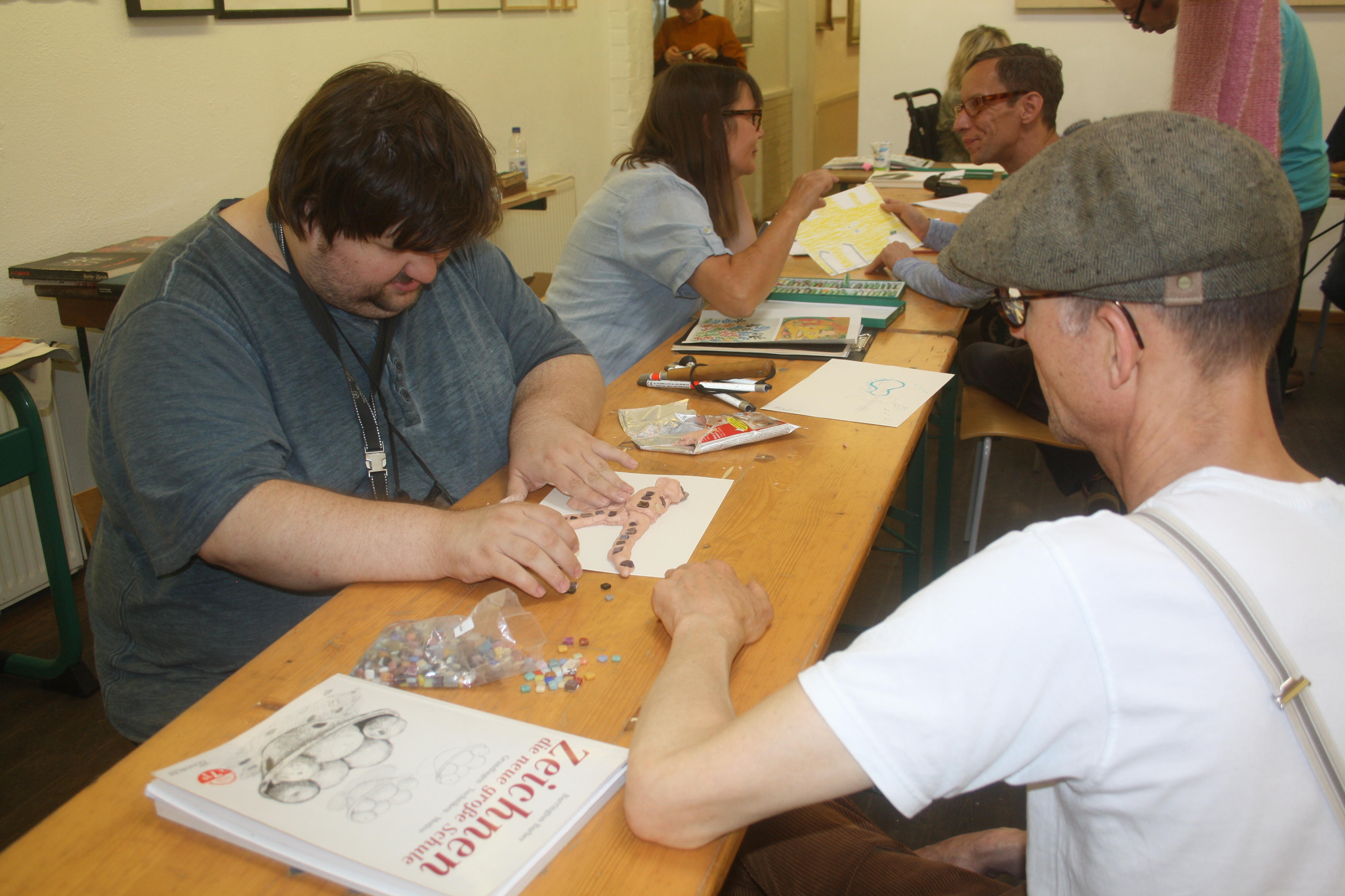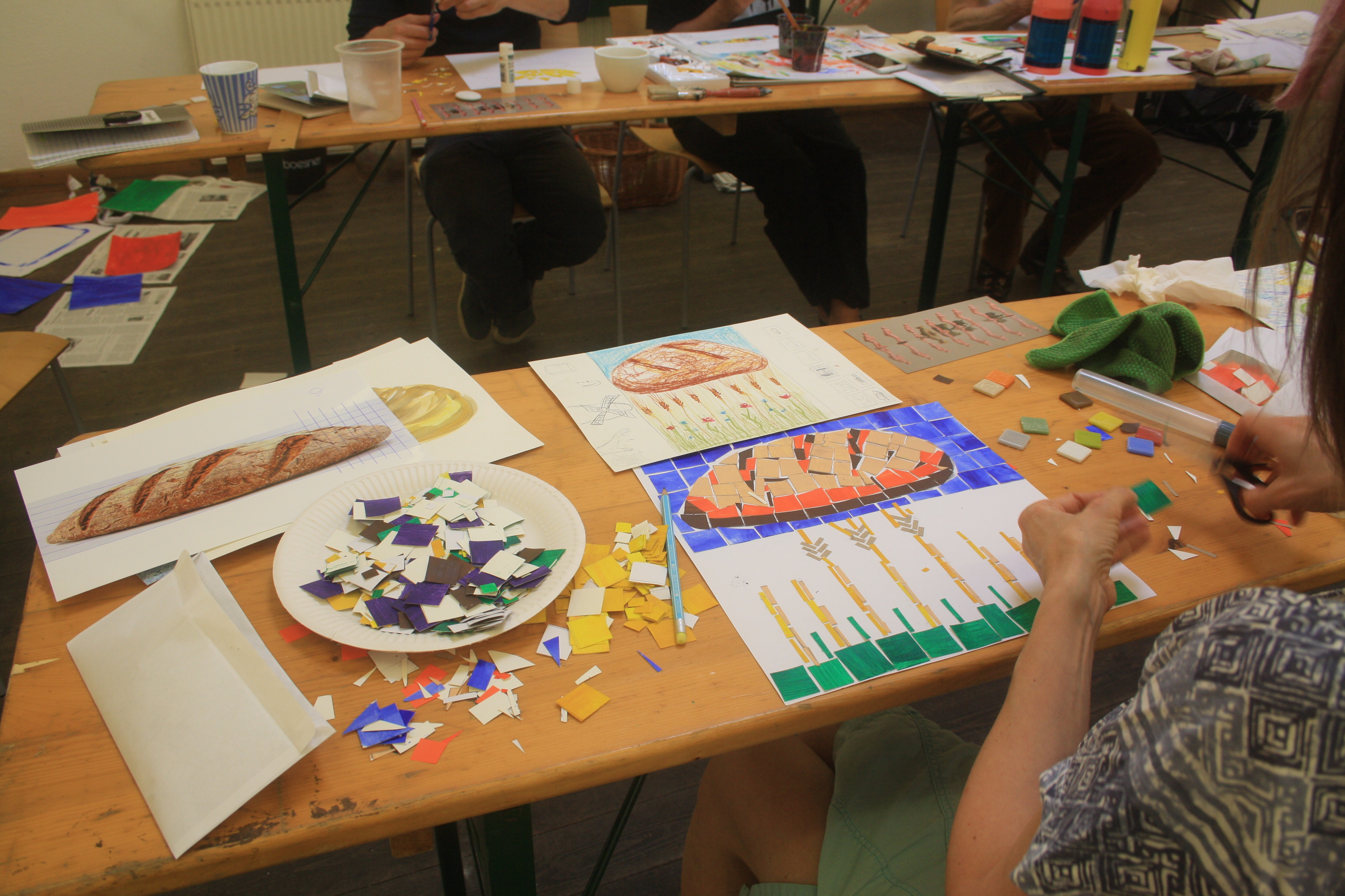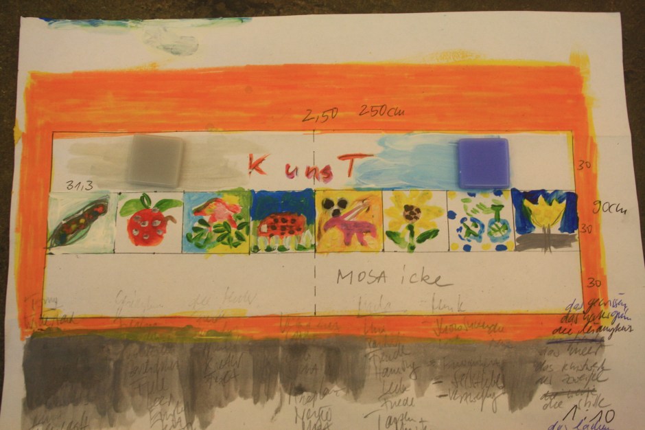 „Was ist für euch Lebensfreude?“ Mit dieser Frage begann unsere Workshopwoche zum Fliesenmosaik (05.08.-09.08.2019) und so unterschiedlich wie unsere Teilnehmer*innen, waren auch die Antworten darauf. Ob nun Musik, Comedy oder der eigene Hund, alle Beiträge waren willkommen und konnten als Grundlage für die Gestaltung des eigenen kleinen Mosaikabschnittes dienen. Es wurden Vorzeichnungen gemacht, es wurde verworfen, überdacht und debattiert. Daraus entstanden die ersten Skizzen und Farbkonzepte, die im Laufe der Woche weiter ausgearbeitet wurden. Der nächste Schritt bestand darin, die fertigen Entwürfe in „Papiermosaiksteinen“ umzusetzen, diese dann aufzukleben und auf der Grundlage die Glasmosaikstein zuschneiden (vielen Dank an Herrn Natterer von der VETROS GmbH – Glasmosaik Division -, der uns dieses schöne Material ermöglicht hat!). Aber die Woche bestand nicht nur aus der Arbeit an den einzelnen Bildabschnitten. Gemeinsam musste ein Motivanordnung entwickelt werden, es gab eine Einführung zur Historie von Fliesenmosaiken und die Realisierung des dreidimensionalen Motives unserer blinden Teilnehmer*innen musste seine Umsetzungform finden. Es war also viel zu tun und trotzdem konnten man vom ersten Tag an eine wunderbare positive Energie zwischen allen Teilnehmer*innen spüren, die jeden lächeln ließ, der den Arbeitsraum in der Galerie der Brotfabrik betrat. Es entstanden persönliche Gespräche zwischen den Teilnehmer*innen, es wurde gesungen und mit Begeisterung Ideen für weitere Treffen zusätzlich zum bestehenden Workshoprahmen aufgenommen. So wird zum einen Ende August eine Exkursion zum S-Bahnhof Wannsee stattfinden, um sich die dort angebrachten Mosaikfreseken anzusehen und sich inspirieren zu lassen. Und zum anderen freuen sich die Teilnehmer*innen sehr über das tolle Angebot des Bogensportclub BB – Berlin e.V. (www.bb-bogenschiessen.de), der die Gruppe zu einem kostenlosen Schnuppertraining eingeladen hat. Denn hier können, dank der Inklusionsarbeit des Bogensportclubs, sich alle zusammen an einem noch unbekannten Sportgerät ausprobieren.