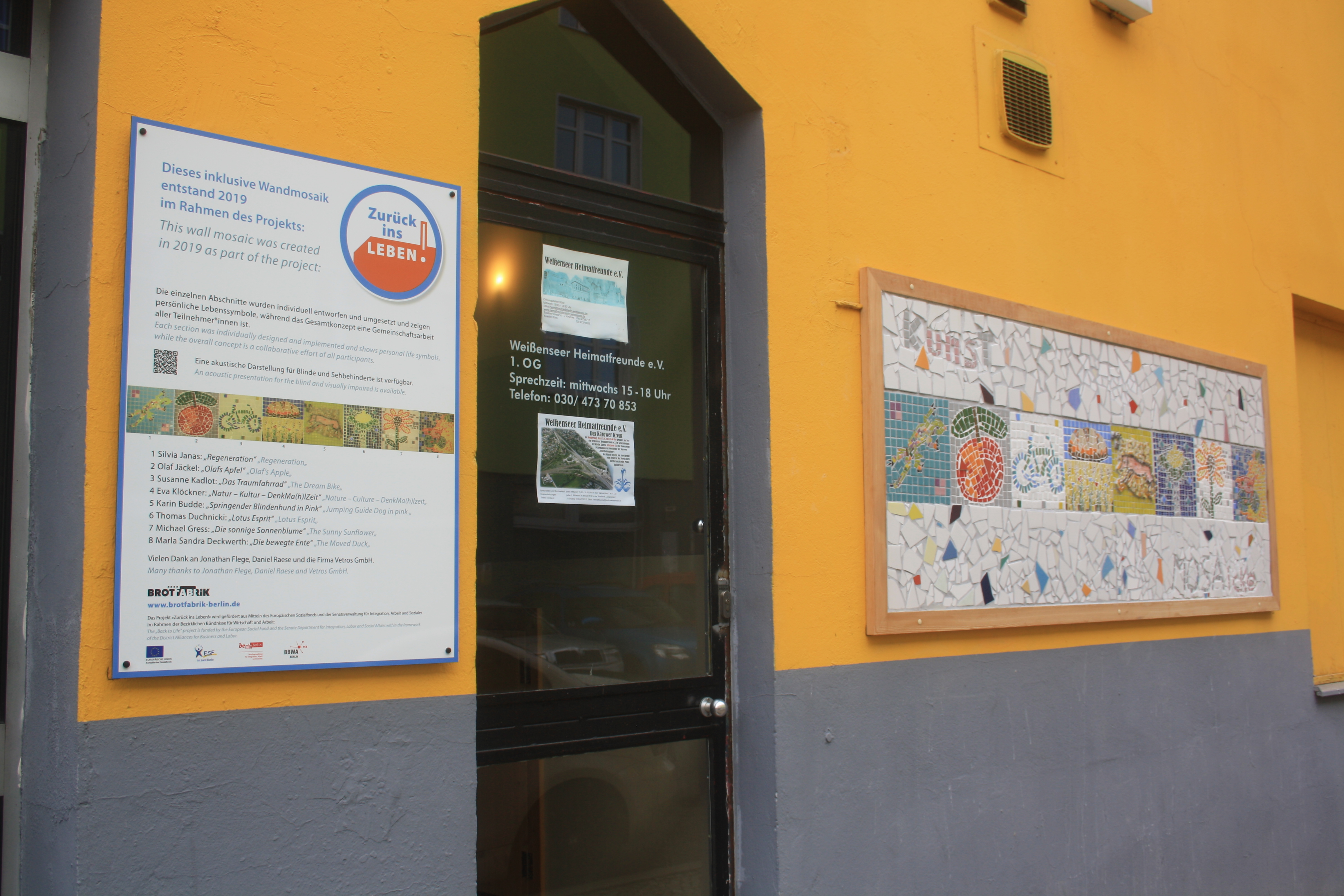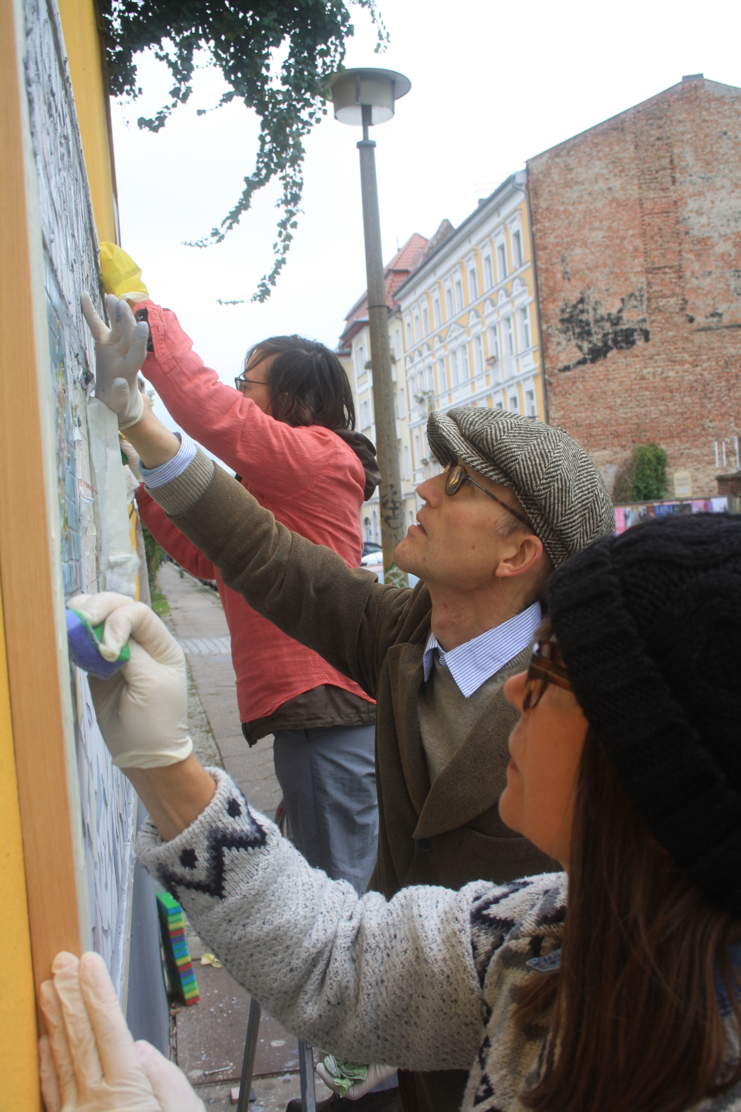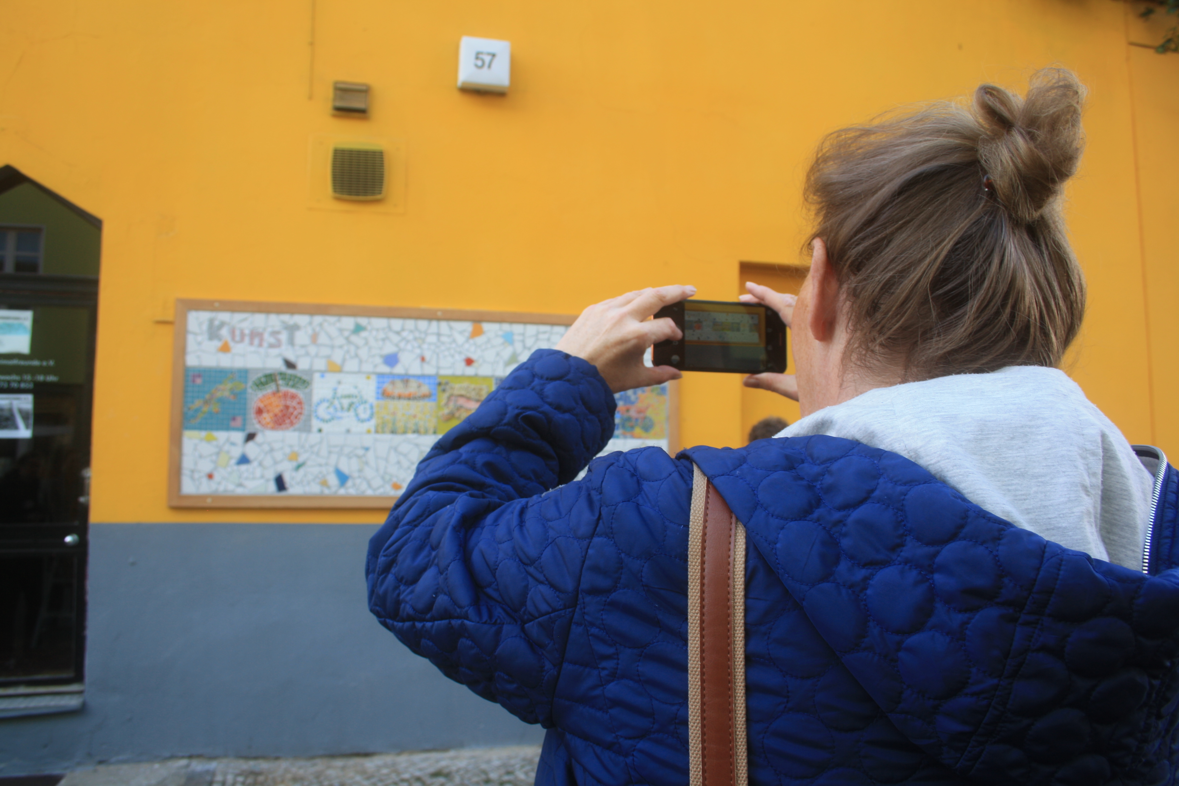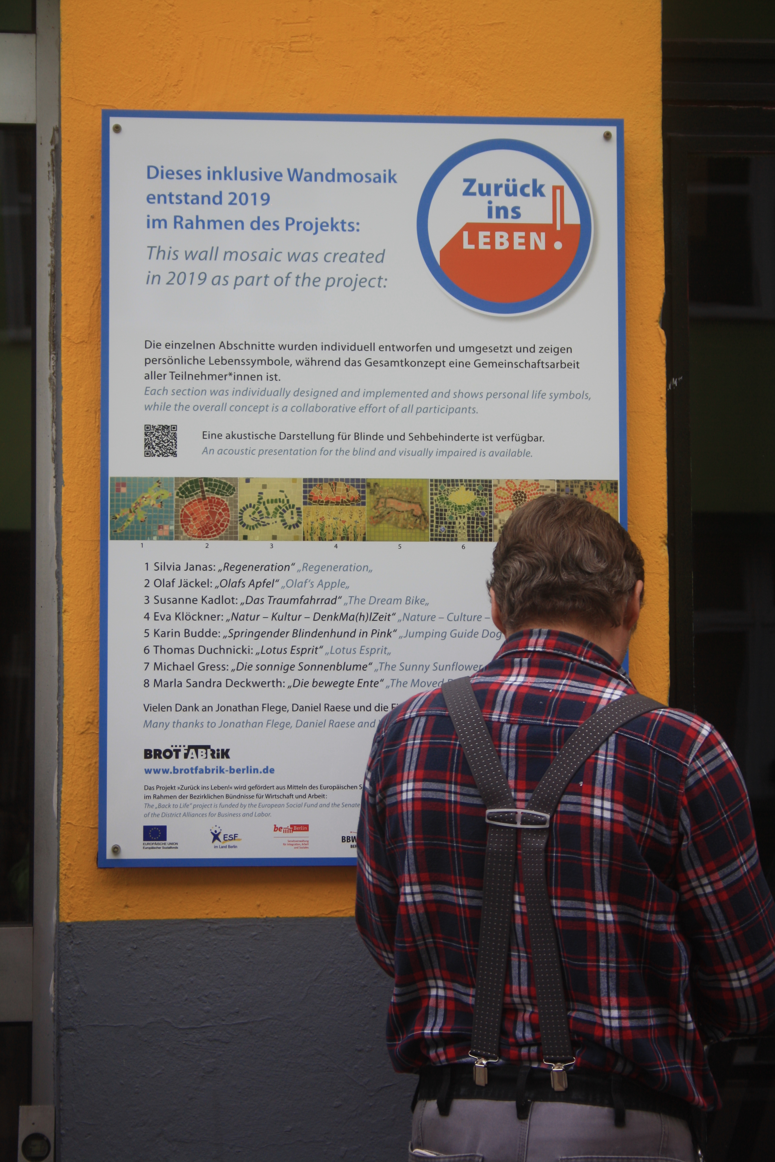Denn nun war der Tag der Enthüllung unseres Wandmosaiks gekommen und um 11 Uhr am 18.10.2019 standen wir, zusammen mit einer Menge geladener Gäste und interessierter Spontanbesucher, vor dem verhüllten Objekt an der Brotfabrikwand zur Heinersdorfer Straße. Zuerst gab es einen Gedichtbeitrag aus dem Stegreif, dann eine schöne Rede von einer Teilnehmerin und im Anschluss die schwungvolle Enthüllung. Tja Christo, das ist viel cooler als verhüllen! Zuerst traute sich keiner so richtig heranzutreten vor Ehrfurcht, aber dann gab es kein halten mehr. Die Oberfläche fühlt sich einfach zu schön an! Es wurden Fotos gemacht und auch der QR-Code auf unserer Tafel ausprobiert. Dieser ist dazu gedacht, dass auch blinde Besucher mithilfe von Audiodateien, die jeden Abschnitt beschreiben, das Mosaik erfahren können. Schön war auch, dass eine Teilnehmerin, die , aufgrund einer Vermittlung in eine Beschäftigung, nicht mehr im Projekt dabei sein kann, heute mit uns feiern konnte. Sie hatte sich sogar einen Urlaubstag genommen!
