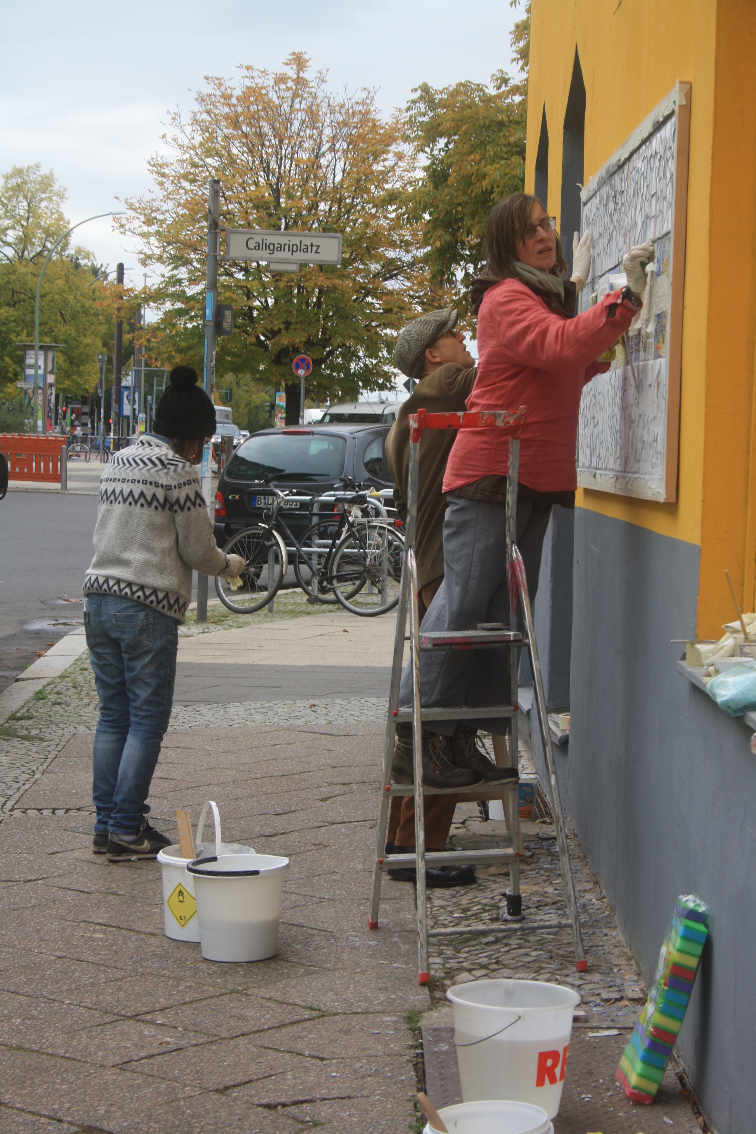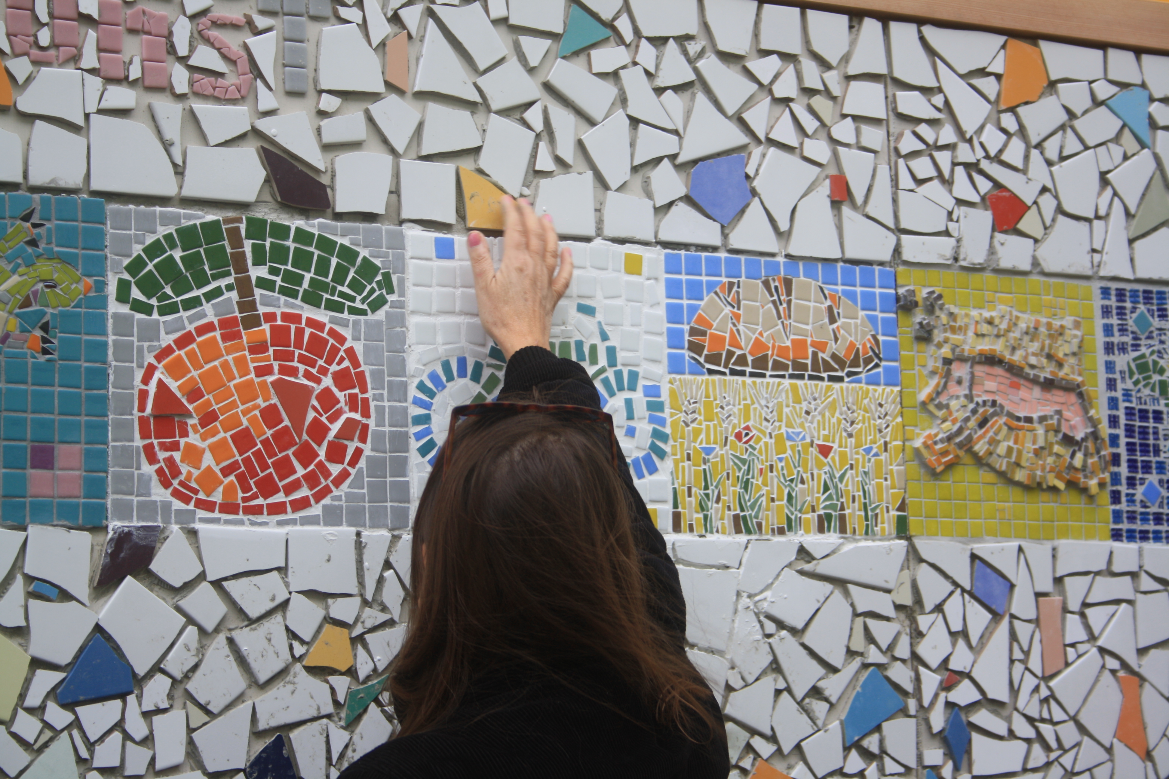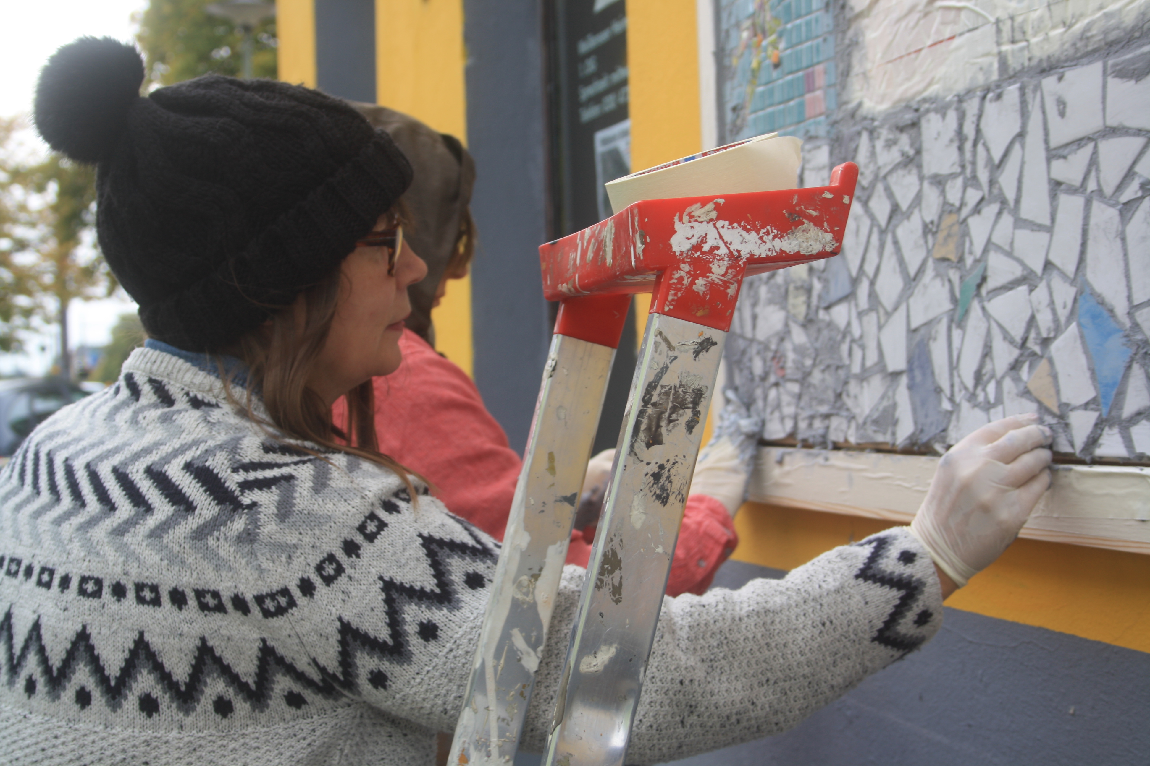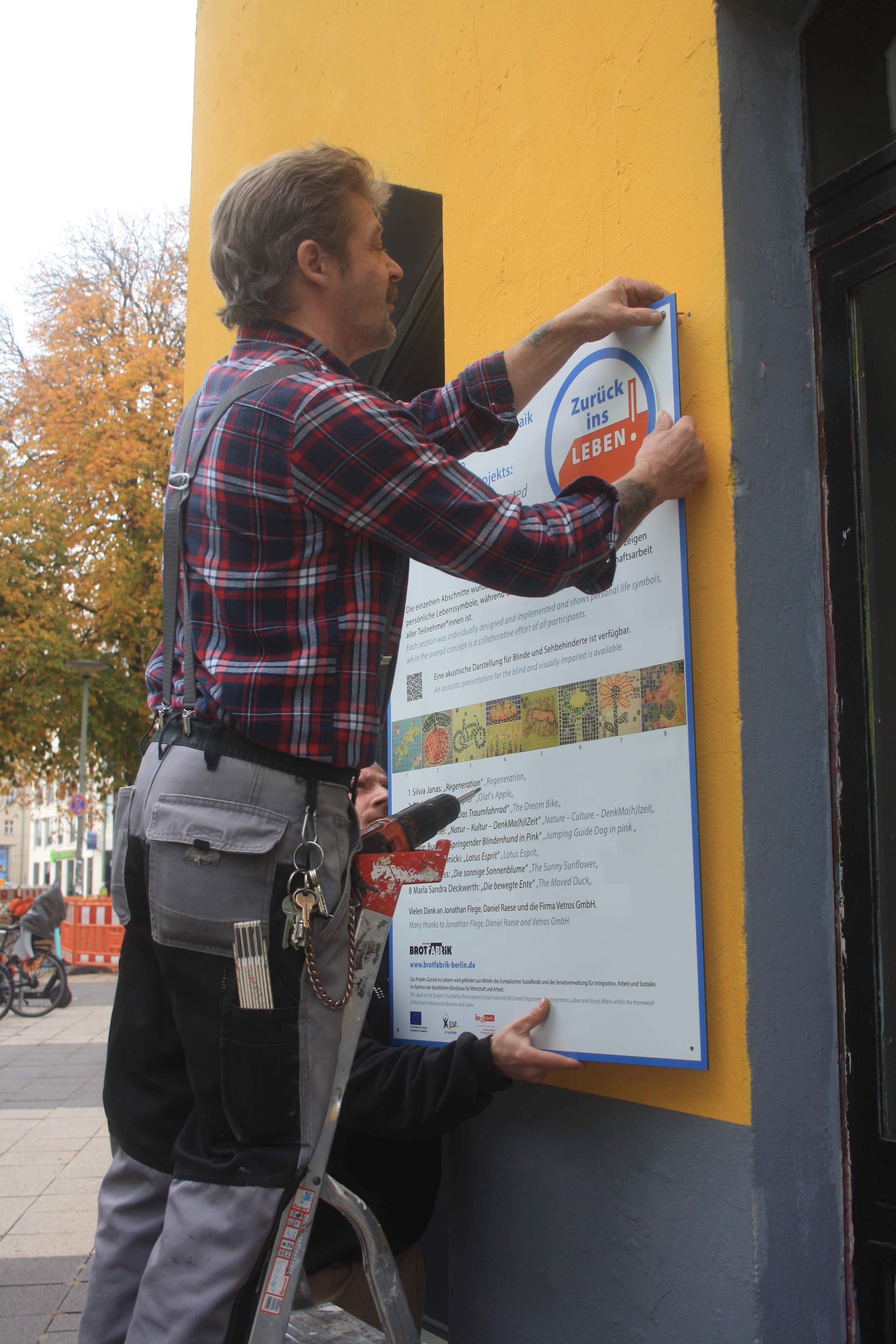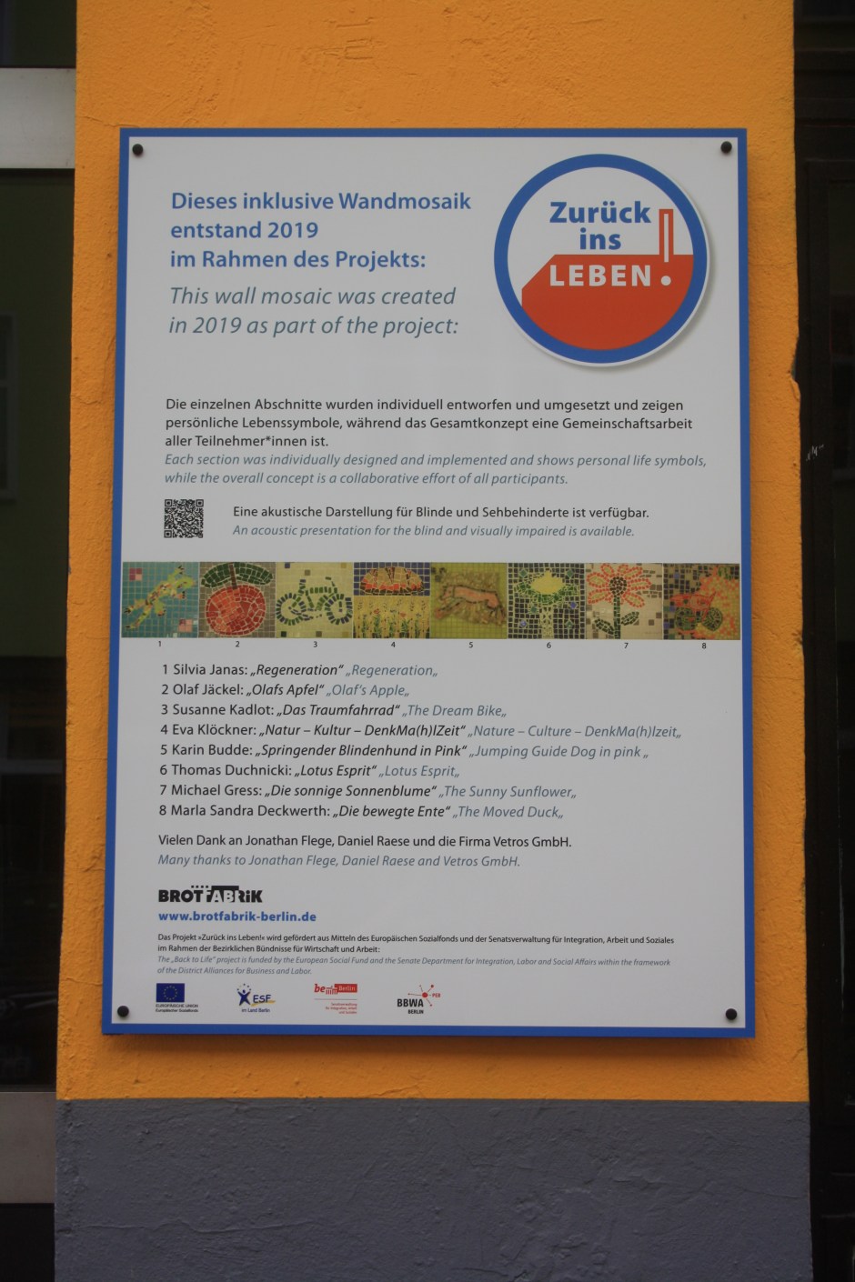 Denn nun war der Tag der Enthüllung unseres Wandmosaiks gekommen und um 11 Uhr am 18.10.2019 standen wir, zusammen mit einer Menge geladener Gäste und interessierter Spontanbesucher, vor dem verhüllten Objekt an der Brotfabrikwand zur Heinersdorfer Straße. Zuerst gab es einen Gedichtbeitrag aus dem Stegreif, dann eine schöne Rede von einer Teilnehmerin und im Anschluss die schwungvolle Enthüllung. Tja Christo, das ist viel cooler als verhüllen! Zuerst traute sich keiner so richtig heranzutreten vor Ehrfurcht, aber dann gab es kein halten mehr. Die Oberfläche fühlt sich einfach zu schön an! Es wurden Fotos gemacht und auch der QR-Code auf unserer Tafel ausprobiert. Dieser ist dazu gedacht, dass auch blinde Besucher mithilfe von Audiodateien, die jeden Abschnitt beschreiben, das Mosaik erfahren können. Schön war auch, dass eine Teilnehmerin, die , aufgrund einer Vermittlung in eine Beschäftigung, nicht mehr im Projekt dabei sein kann, heute mit uns feiern konnte. Sie hatte sich sogar einen Urlaubstag genommen!