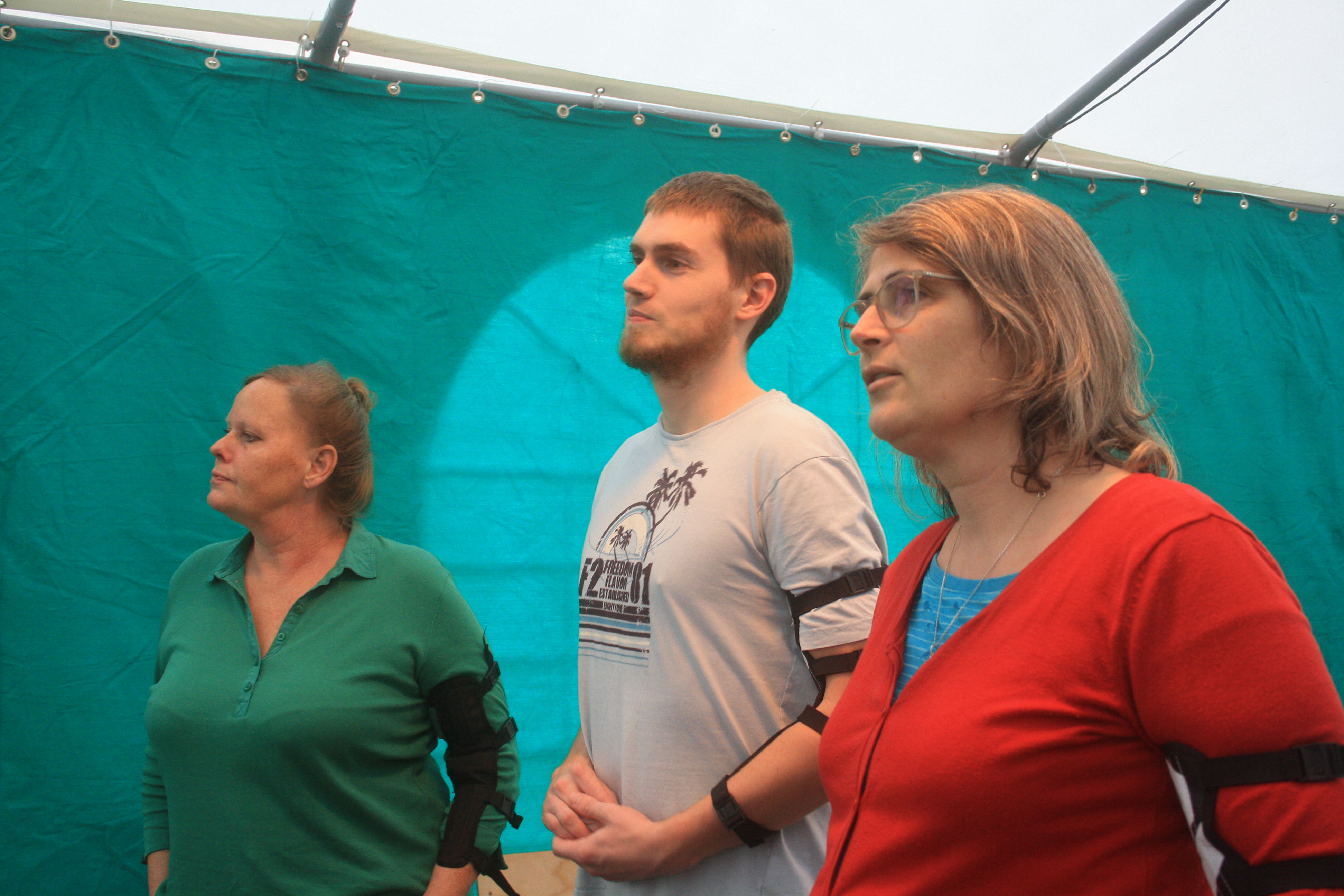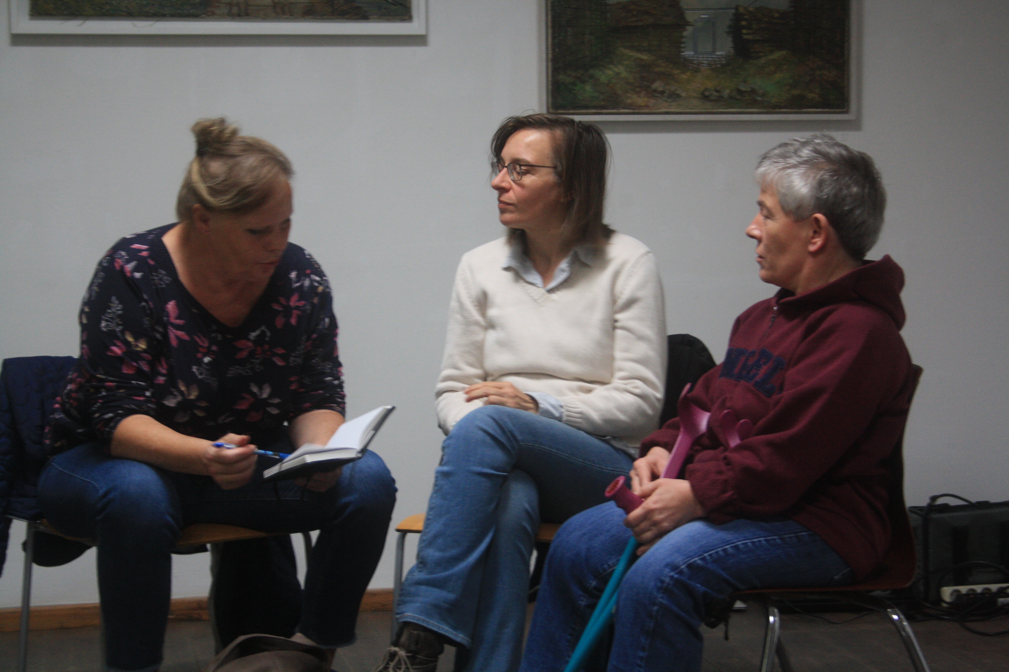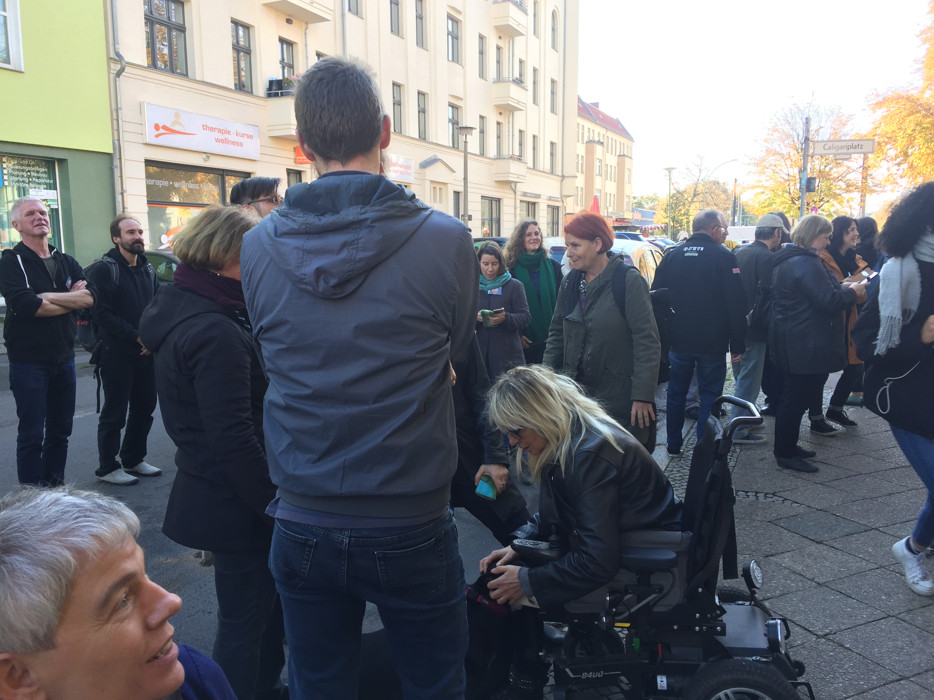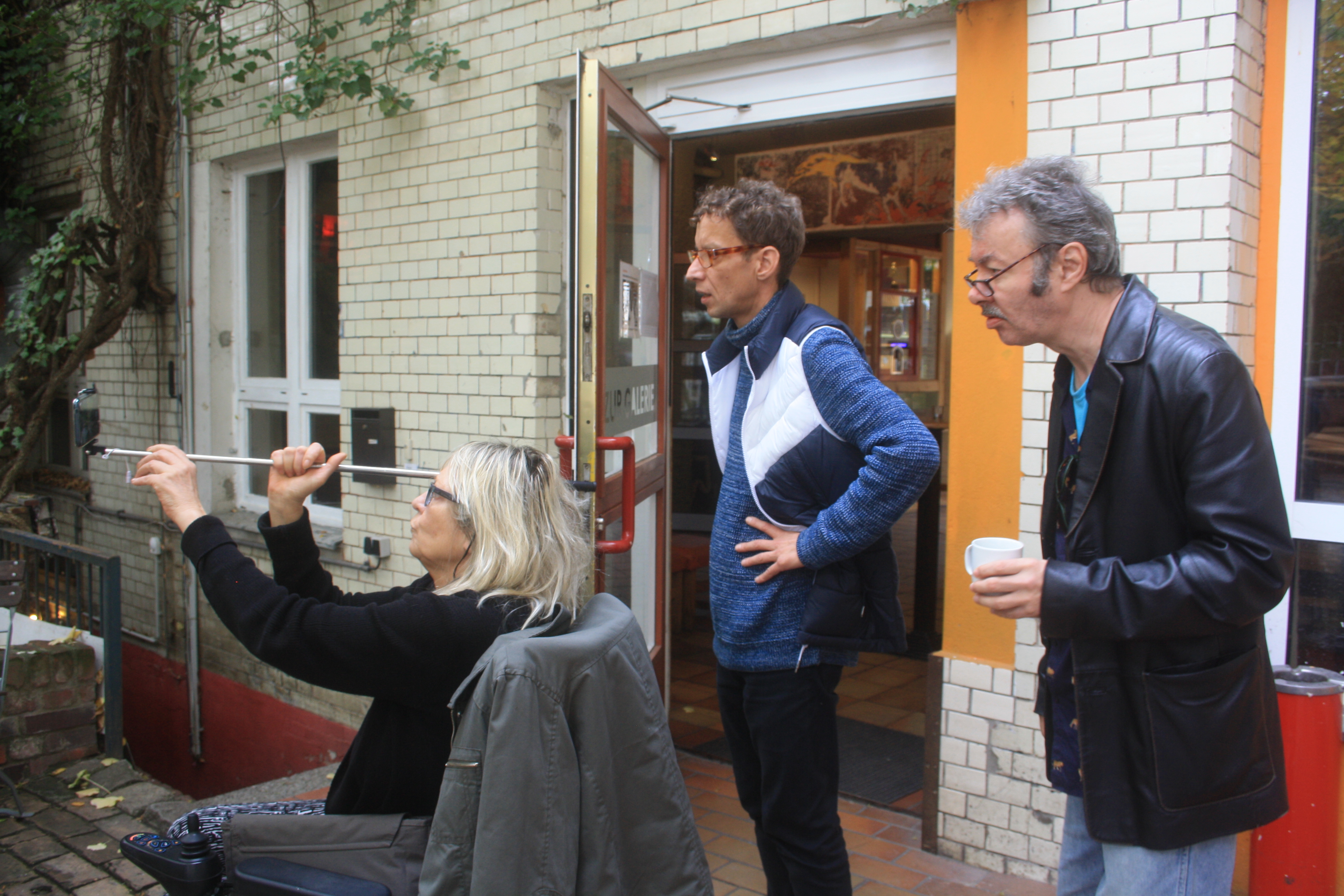 Denn nun war der Tag der Enthüllung unseres Wandmosaiks gekommen und um 11 Uhr am 18.10.2019 standen wir, zusammen mit einer Menge geladener Gäste und interessierter Spontanbesucher, vor dem verhüllten Objekt an der Brotfabrikwand zur Heinersdorfer Straße. Zuerst gab es einen Gedichtbeitrag aus dem Stegreif, dann eine schöne Rede von einer Teilnehmerin und im Anschluss die schwungvolle Enthüllung. Tja Christo, das ist viel cooler als verhüllen! Zuerst traute sich keiner so richtig heranzutreten vor Ehrfurcht, aber dann gab es kein halten mehr. Die Oberfläche fühlt sich einfach zu schön an! Es wurden Fotos gemacht und auch der QR-Code auf unserer Tafel ausprobiert. Dieser ist dazu gedacht, dass auch blinde Besucher mithilfe von Audiodateien, die jeden Abschnitt beschreiben, das Mosaik erfahren können. Schön war auch, dass eine Teilnehmerin, die , aufgrund einer Vermittlung in eine Beschäftigung, nicht mehr im Projekt dabei sein kann, heute mit uns feiern konnte. Sie hatte sich sogar einen Urlaubstag genommen!