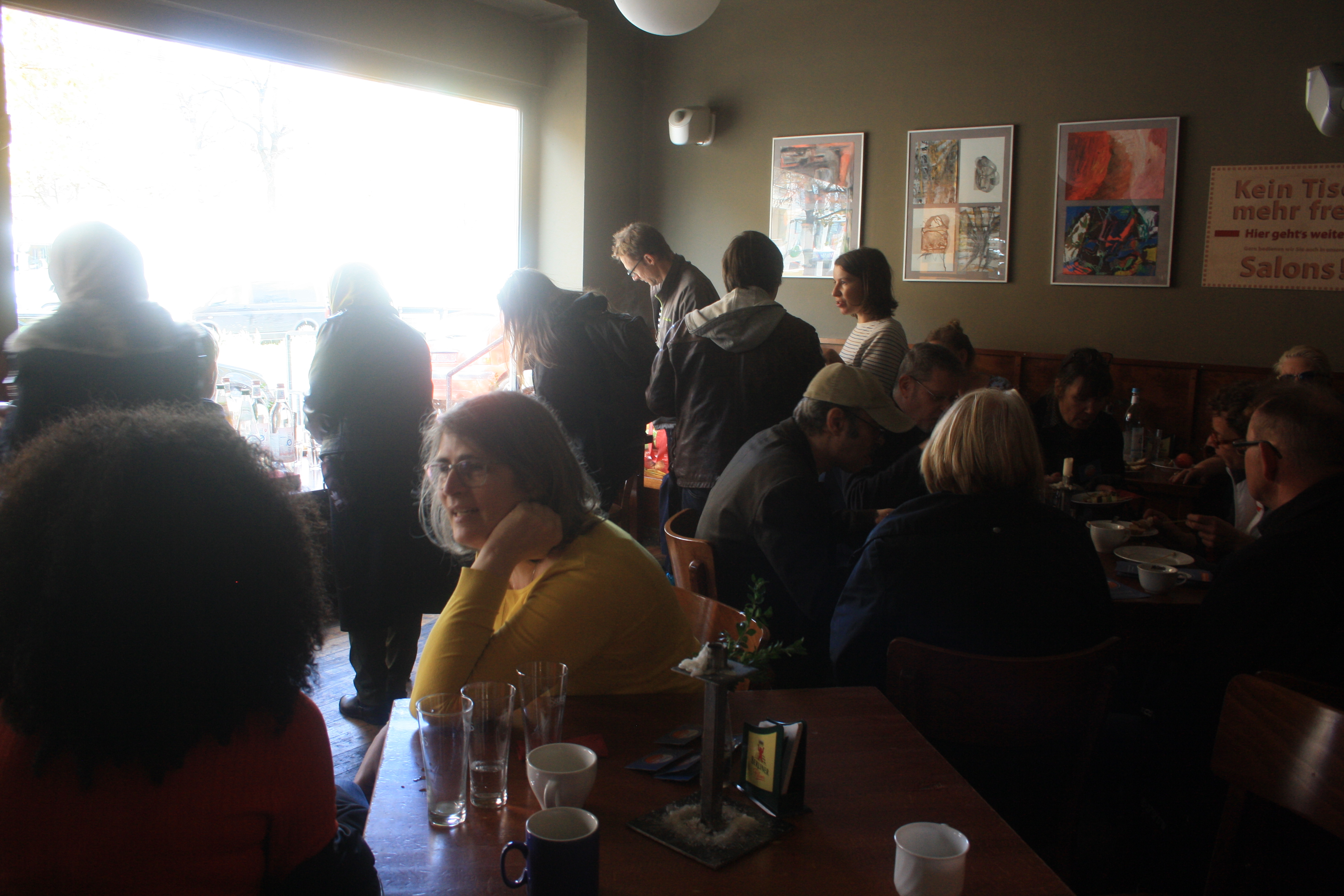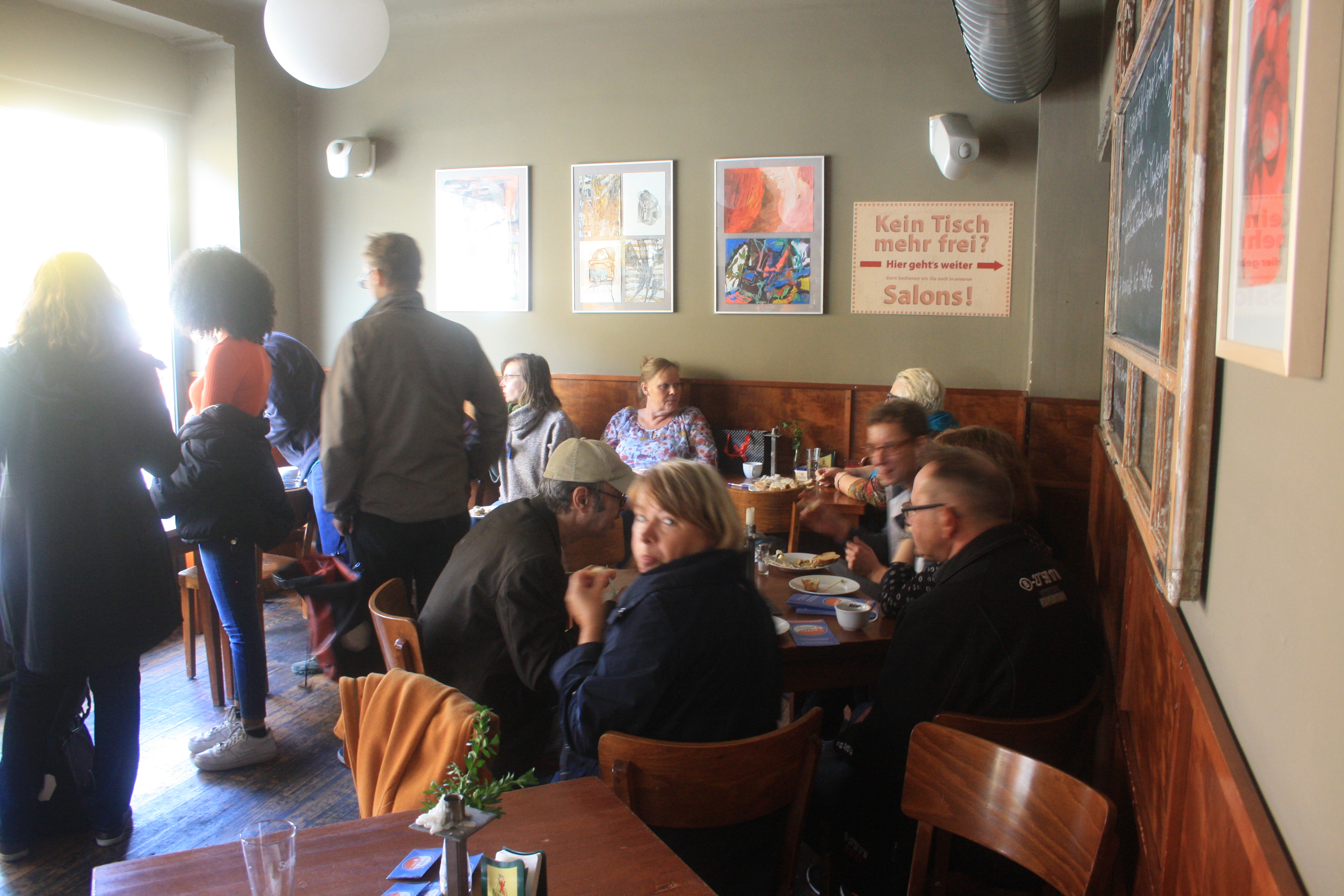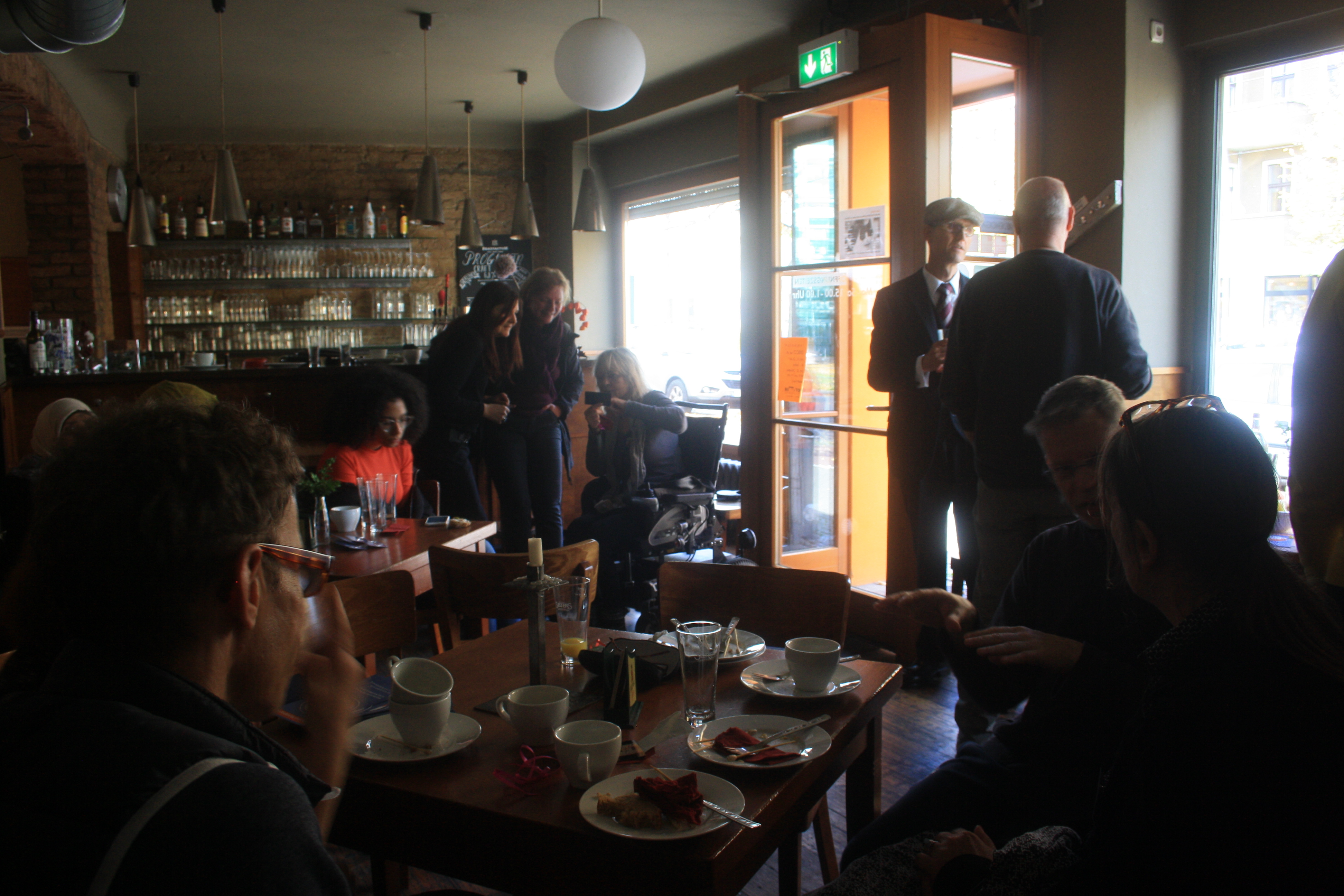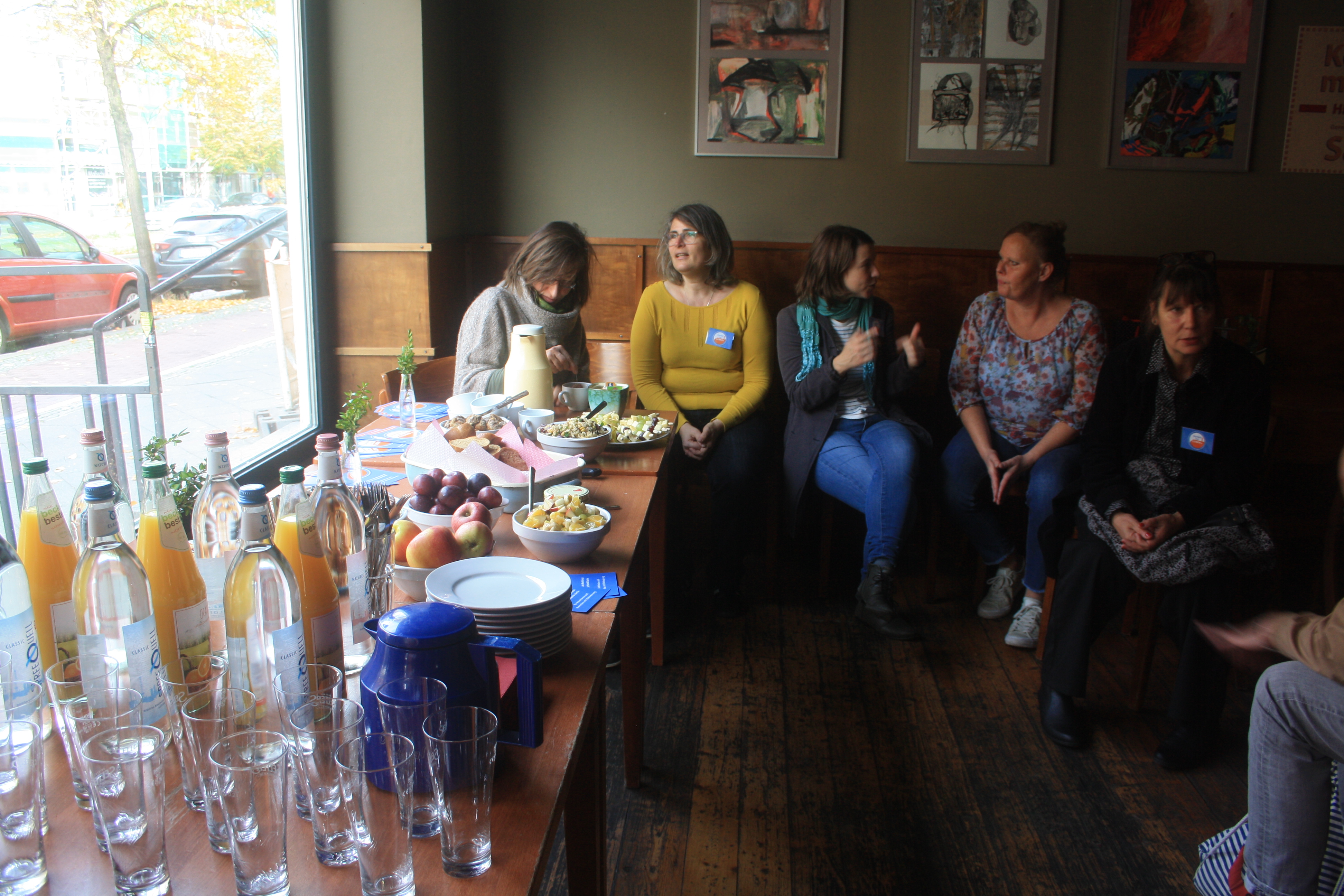 Wer noch Zeit hatte, konnte nun bei einem, von den Teilnehmer*innen selbstgemachten, Buffett in der BrotfabrikKneipe, das Ereignis ausklingen lassen. Dabei kam nicht nur heraus, dass wir ein Geburtstagskind unter uns hatten (da musste natürlich gesungen werden), sondern es wurden auch Geschenke verteilt. Jeder, der mitgemacht hatte an dem Mosaik, bekam einen Magneten mit einem Bild vom Mosaik drauf. So hatte jeder das Gemeinschaftwerk zu Hause! Und sogar Herr Bernd Wähner von der Lokalzeitung Berliner Woche kam vorbei, um Fotos und Infos für einen Artikel über das Mosaik und seine Enthüllung zusammen zu tragen. Vielen Dank dafür!