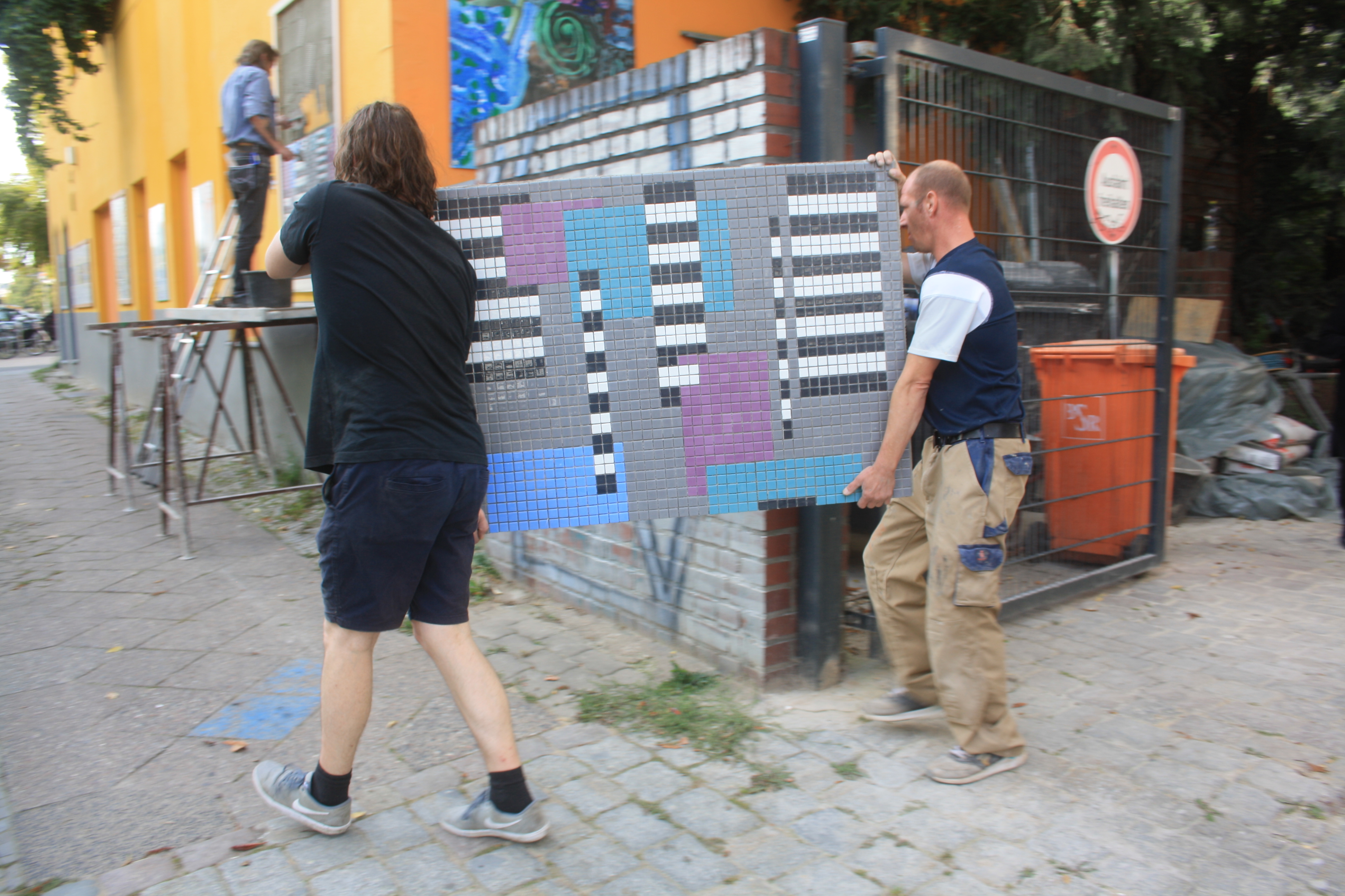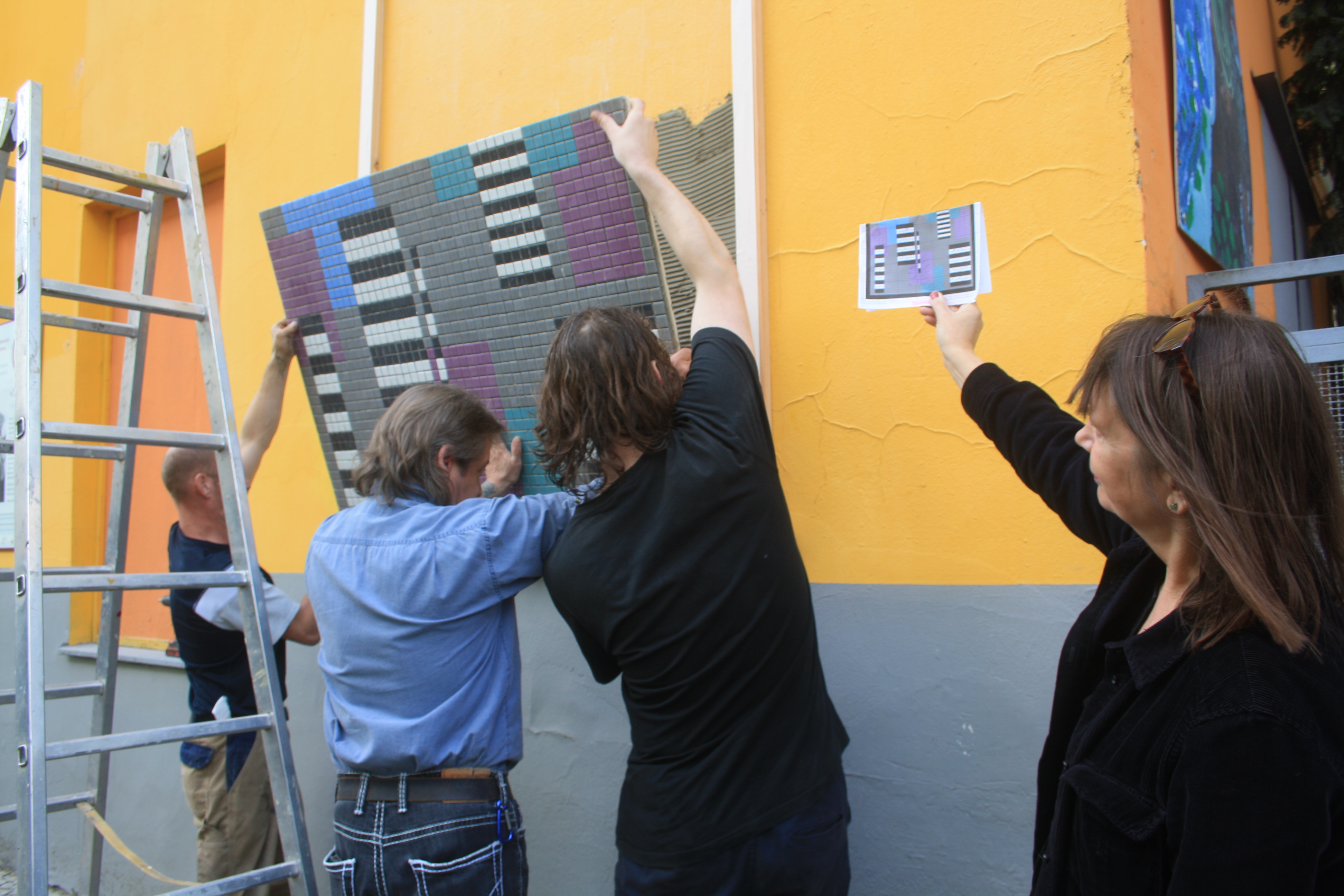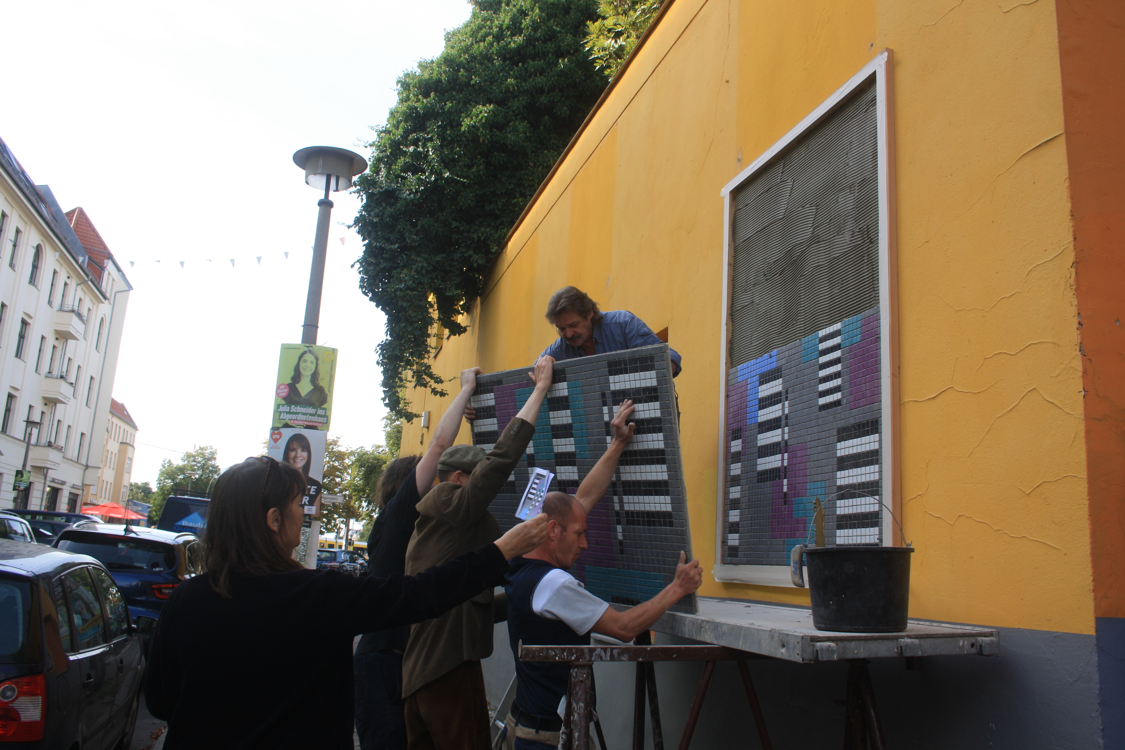 Es hängt! Es hängt und sieht toll aus! Es hängt, sieht toll aus und hat gestern wirklich schöne Aufmerksamkeit in Form einer Enthüllungsfeier, neugierigen Zuschauern und einer tollen Rede von Petra Schröck bekommen. Endlich ist die Wand an der Heinersdorfer Str. vollständig mit den Mosaiken bestückt und kann alle Vorbeikommenden erfreuen. Danke an alle, die sie betrachten, an alle, die mitgeholfen haben, dass es enstehen und werden kann und danke an alle, die uns dabei unterstützen!