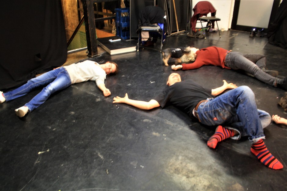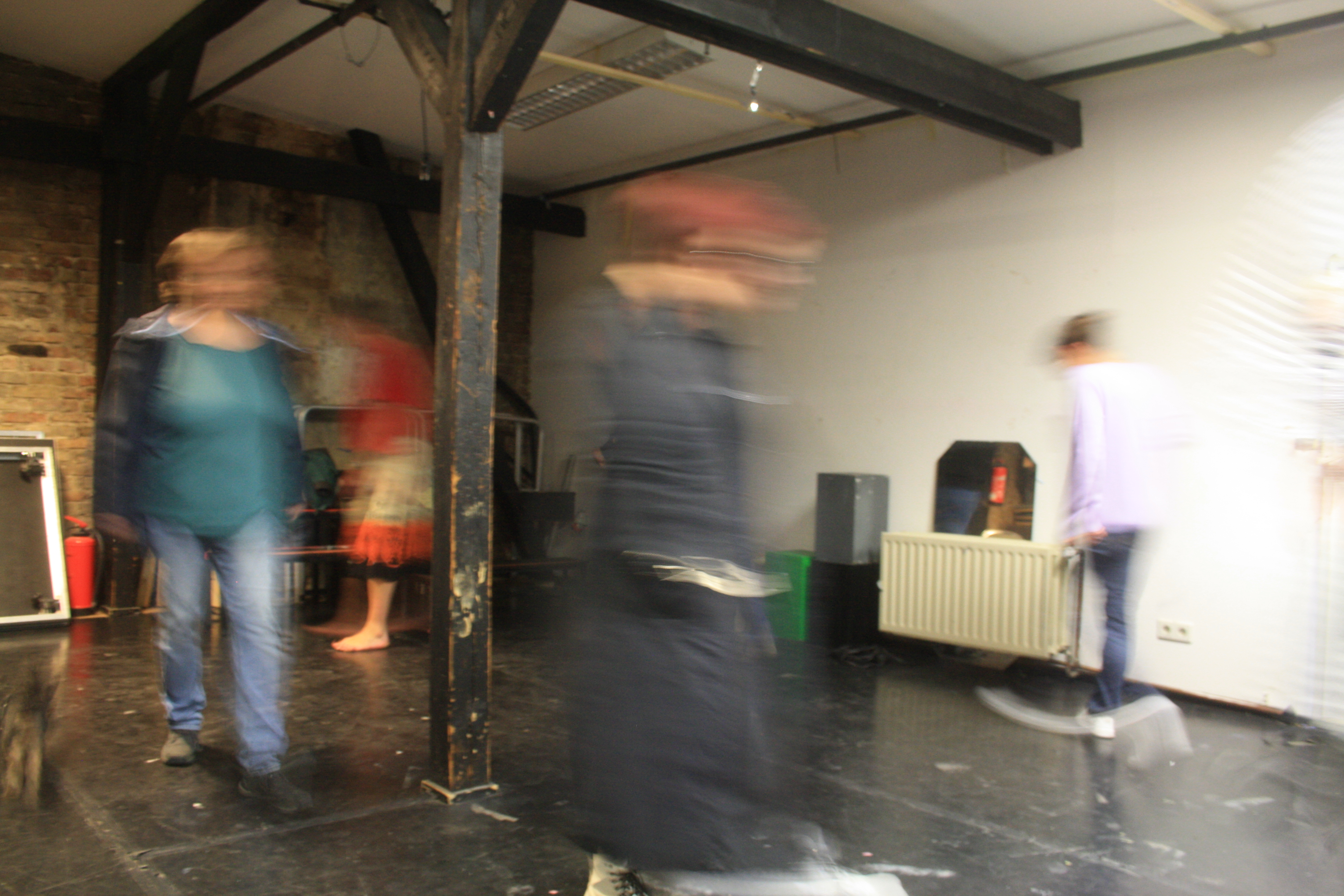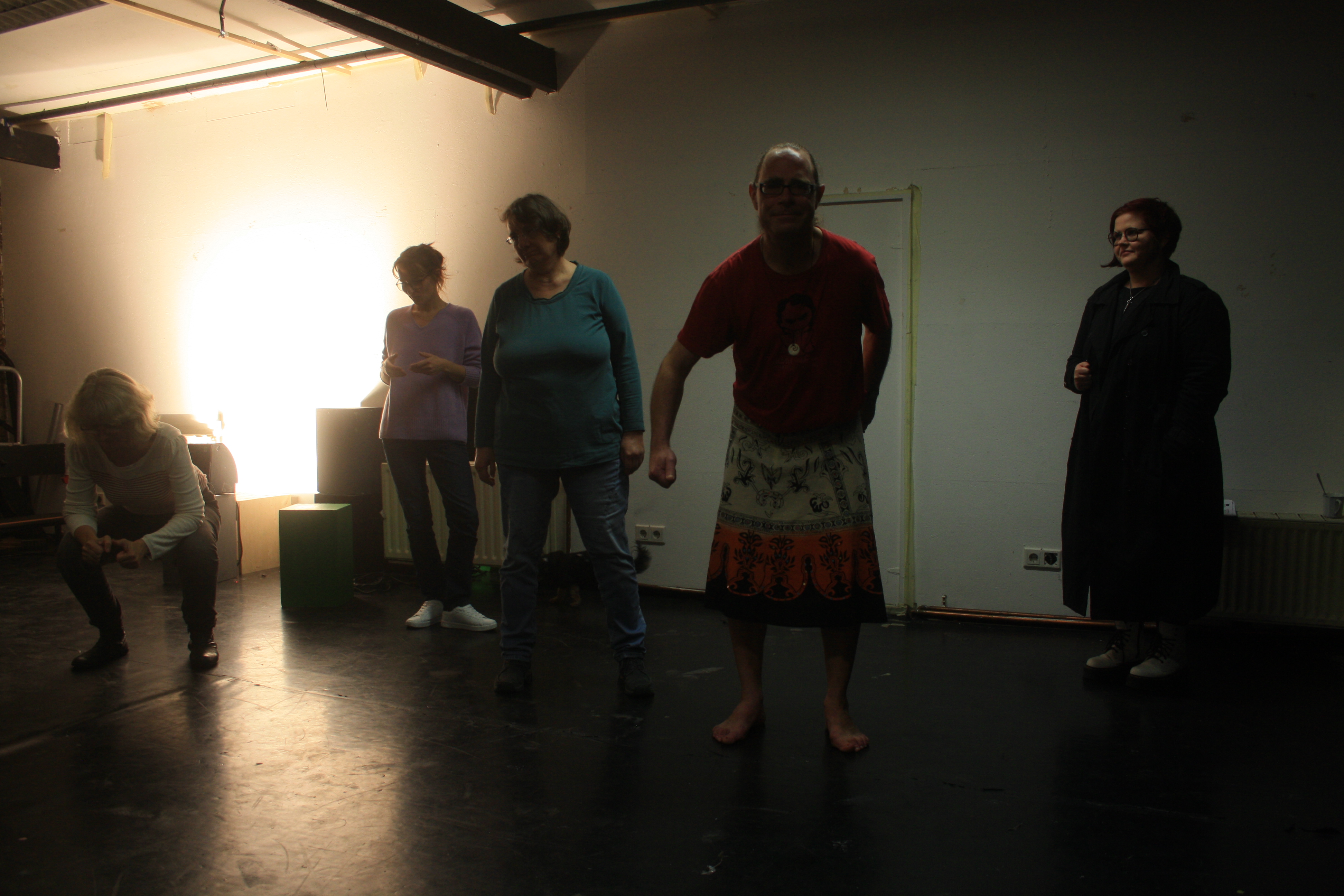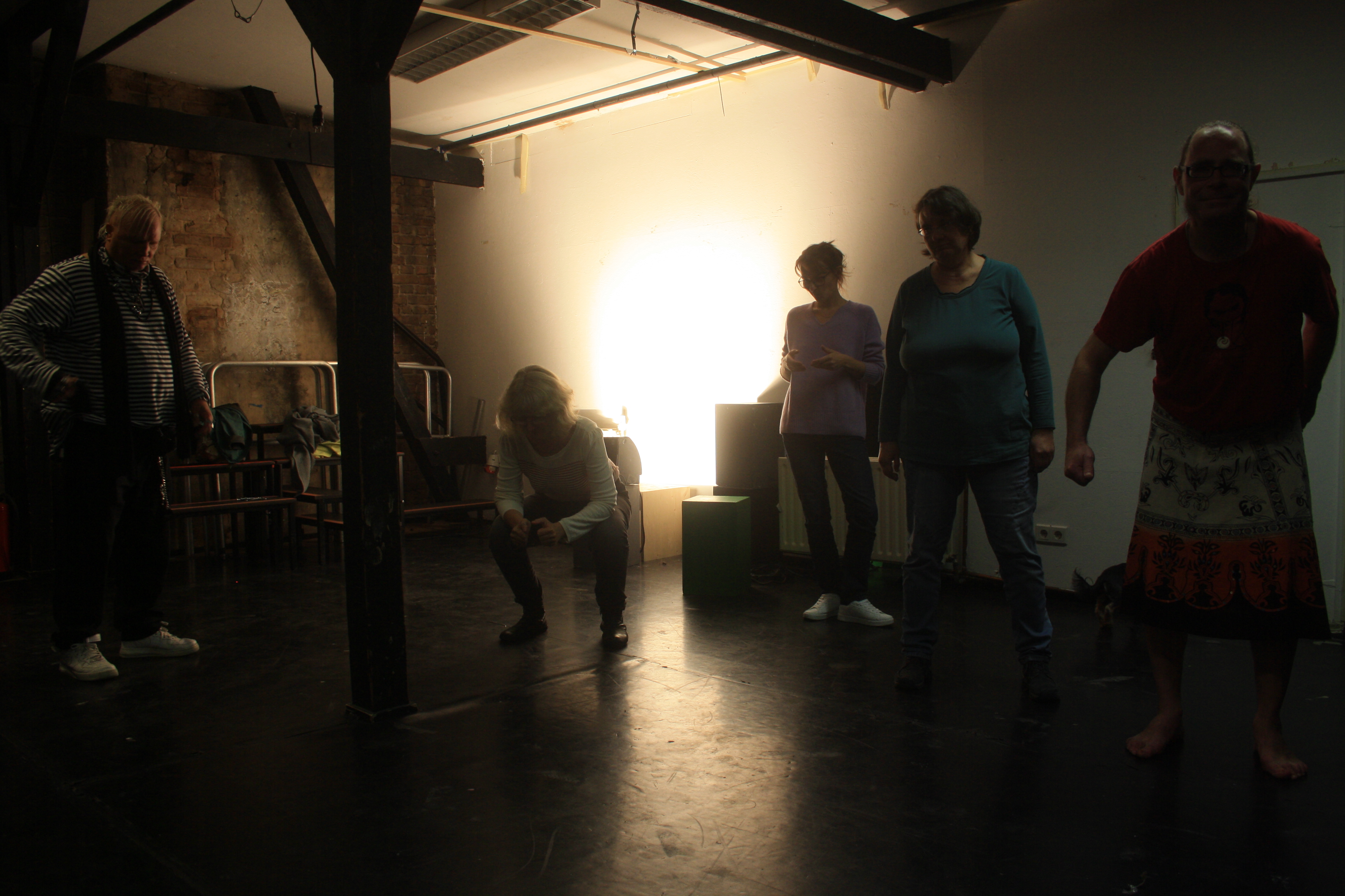 Stefan Kreißig, der Brachechef und Assistent der Bühnenleitung in der Brotfabrik, führte die Teilnehmer*innen beim gestrigen Workshop zum Thema „Theater: Körpererfahrung“ durch Meditationen und leichte Übungen zur Selbsterfahrung. Dabei wurde bei einem fiktiven Mafiatreffen nicht nur äußerst kunstvoll gestorben, sondern auch fokussiert, im Zickzack gelaufen und der Raum um sich erspürt. Eine spannende Erfahrung!